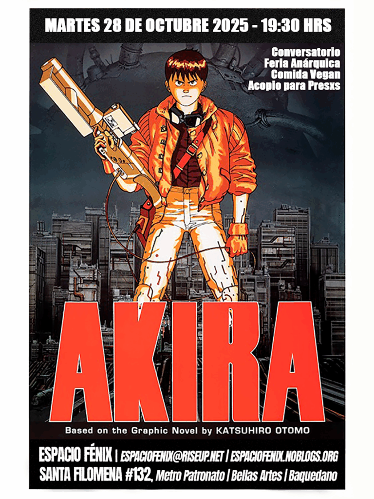 🎬 En el marco del ciclo de actividades «Resistencia y Ofensiva» de Espacio Fénix, se proyectará la película AKIRA (アキラ) de Katsuhiro Ōtomo (1988).