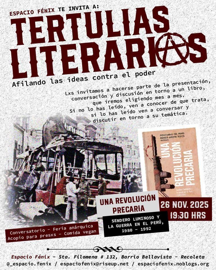 El propósito de esta tertulia es plantear una inquietud acerca de las influencias que los intentos revolucionarios de la ideología marxiana pueden ejercer, a lo largo del tiempo, sobre las ideas y prácticas anárquicas. A la luz de los antecedentes que entrega este libro: ¿Es homologable la precariedad en la lucha entre el marxismo y el anarquismo insurreccional? ¿Qué distancias y/o cercanías nos produce un partido como el de Sendero Luminoso? ¿Qué pensamos de las estrategias de lucha de las comunidades locales en el contexto de la guerra civil en Perú?